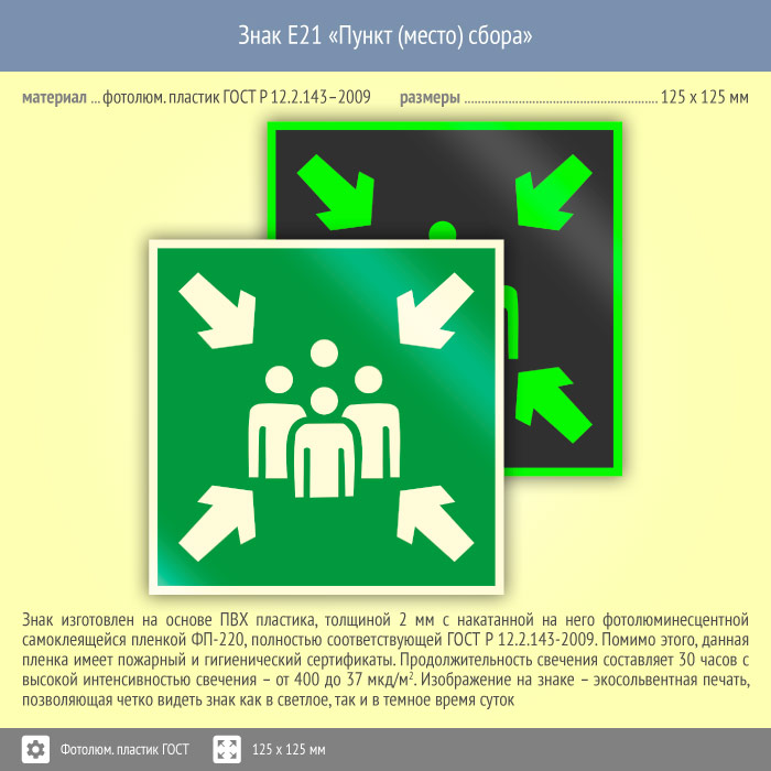 Знак E21 «Пункт (место) сбора» (фотолюминесцентный пластик ГОСТ 34428-2018, 125х125 мм) в Нижнекамске купить
