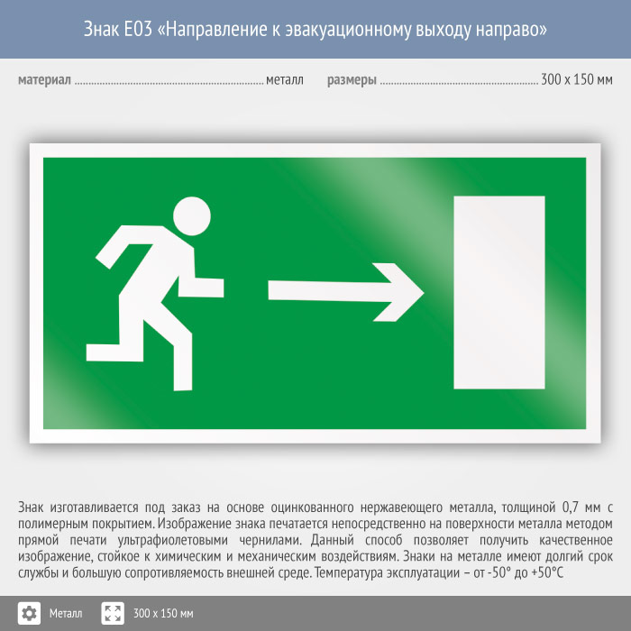 Знак E03 «Направление к эвакуационному выходу направо» (металл, 300х150 мм) в Нижнекамске купить