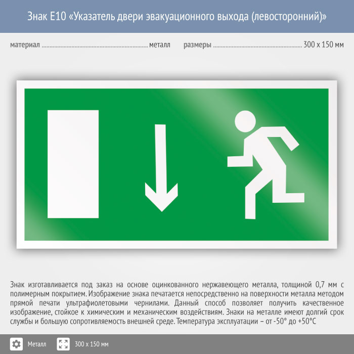 Знак E10 «Указатель двери эвакуационного выхода (левосторонний)» (металл, 300х150 мм) в Нижнекамске купить