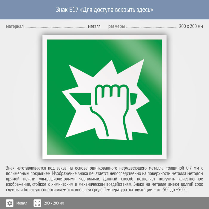 Знак E17 «Для доступа вскрыть здесь» (металл, 200х200 мм) в Нижнекамске купить