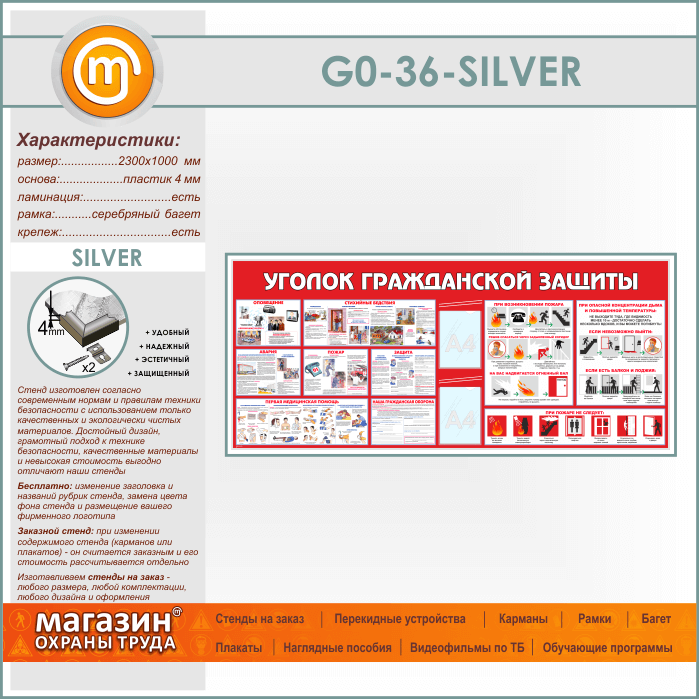 Стенд «Уголок гражданской защиты» c 2 карманами (GO-36-SILVER) в Нижнекамске купить