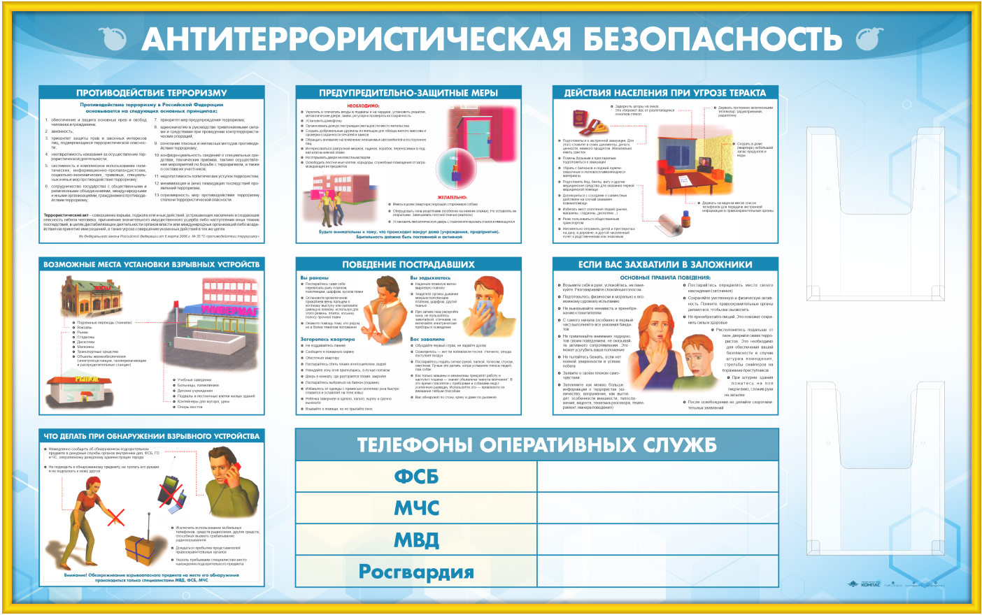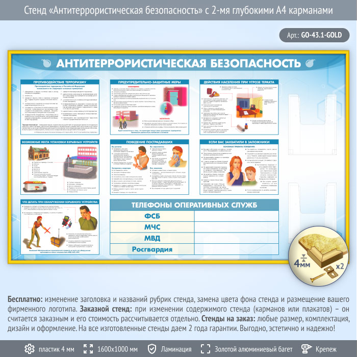 Стенд «Антитеррористическая безопасность» с 2-мя глубокими А4 карманами (GO-43.1-GOLD) в Нижнекамске купить