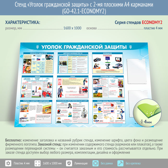 Стенд «Уголок гражданской защиты» с 2-мя плоскими А4 карманами (GO-42.1-ECONOMY2) в Нижнекамске купить