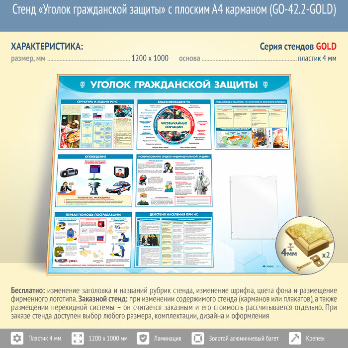 Стенд «Уголок гражданской защиты» с плоским А4 карманом (GO-42.2-GOLD) в Нижнекамске купить