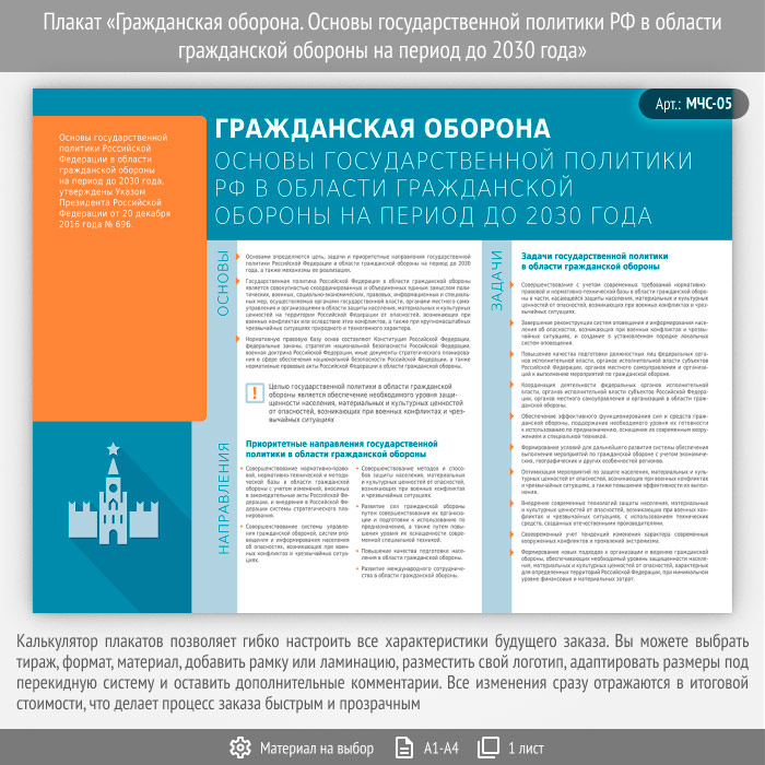 Плакат «Гражданская оборона. Основы государственной политики РФ в области гражданской обороны на период до 2030 года» (МЧС-05, 1 лист) в Нижнекамске купить