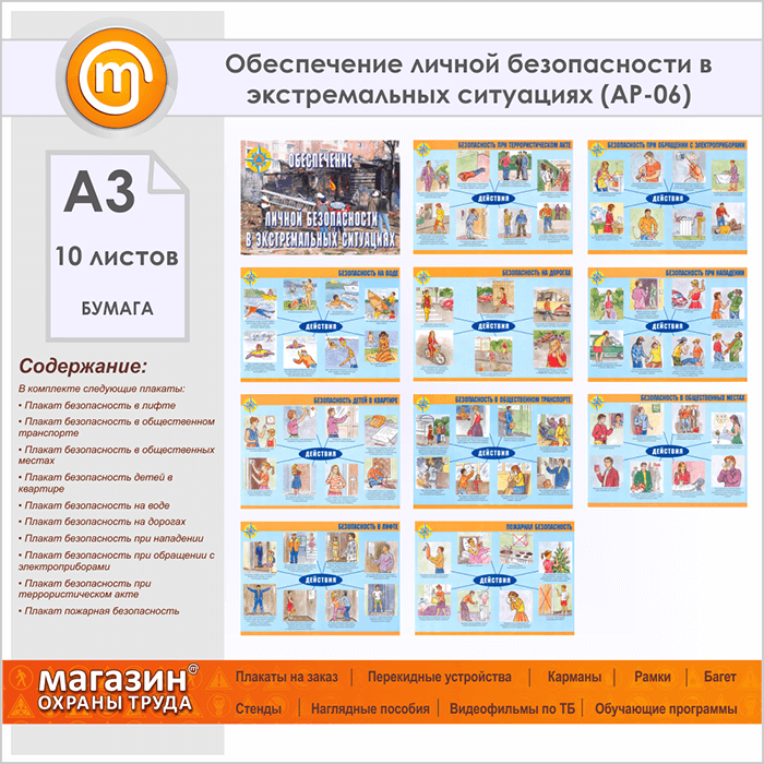 Плакаты «Обеспечение личной безопасности в экстремальных ситуациях» (АР-06, бумага, А3, 10 листов) в Нижнекамске купить