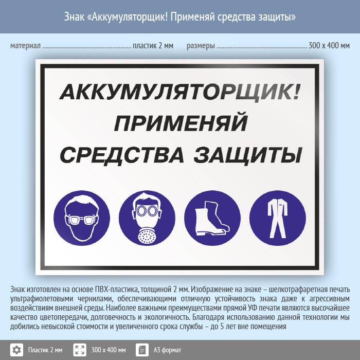 Знак «Аккумуляторщик! Применяй средства защиты», КЗ-02 (пластик, 400х300 мм) в Нижнекамске купить