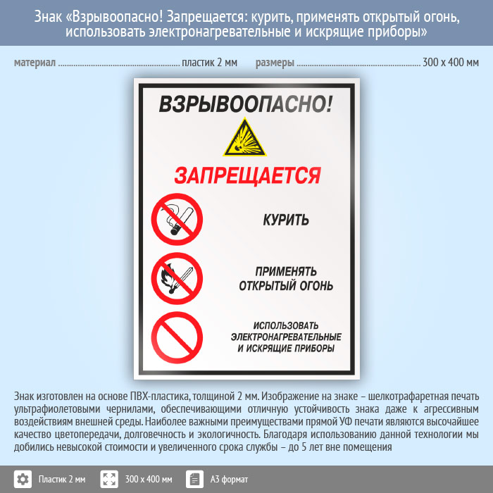 Знак «Взрывоопасно! Запрещается: курить, применять открытый огонь, использовать электронагревательные и искрящие приборы», КЗ-10 (пластик, 300х400 мм) в Нижнекамске купить