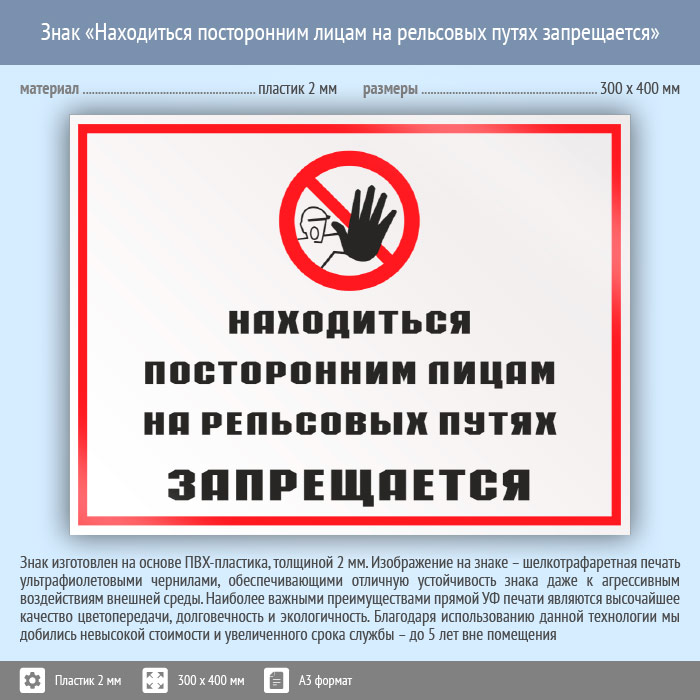 Знак «Находиться посторонним лицам на рельсовых путях запрещается», КЗ-25 (пластик, 400х300 мм) в Нижнекамске купить