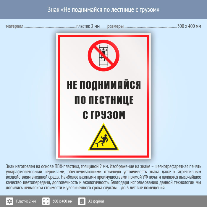 Знак «Не поднимайся по лестнице с грузом», КЗ-28 (пластик, 300х400 мм) в Нижнекамске купить