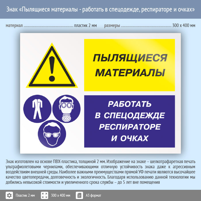 Знак «Пылящиеся материалы - работать в спецодежде, респираторе и очках», КЗ-79 (пластик, 400х300 мм) в Нижнекамске купить