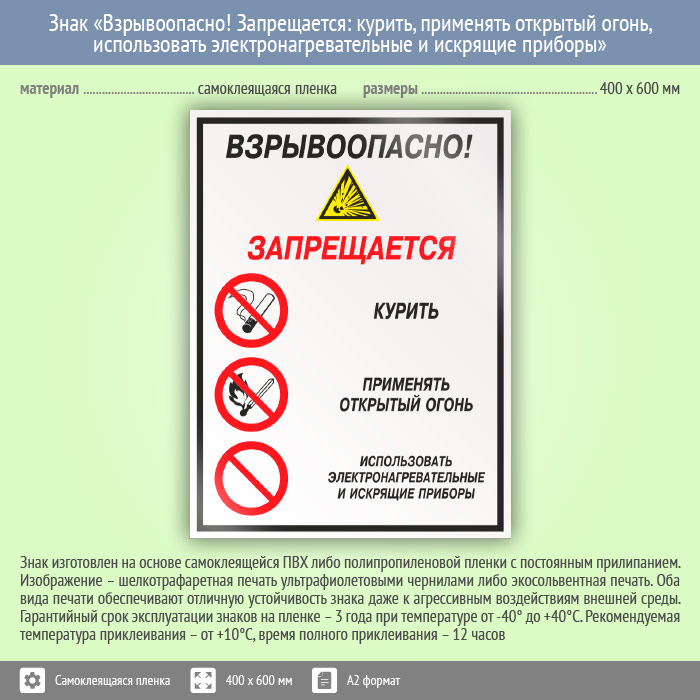 Знак «Взрывоопасно! Запрещается: курить, применять открытый огонь, использовать электронагревательные и искрящие приборы», КЗ-10 (пленка, 400х600 мм) в Нижнекамске купить