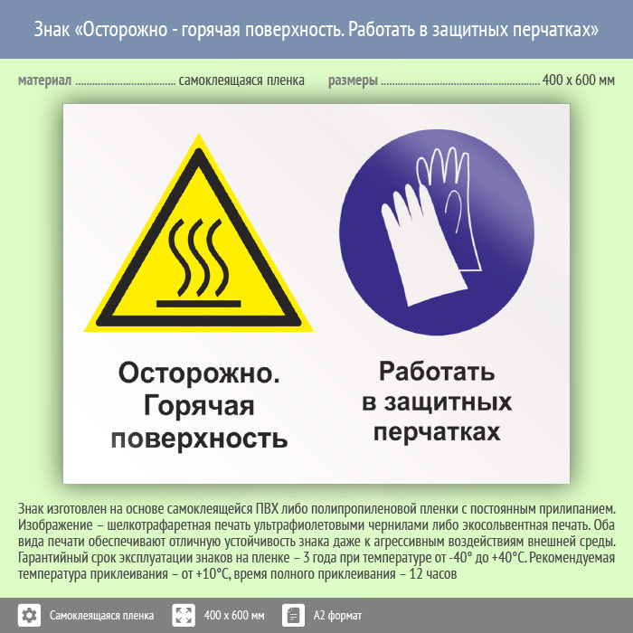 Знак «Осторожно - горячая поверхность. Работать в защитных перчатках», КЗ-55 (пленка, 600х400 мм) в Нижнекамске купить