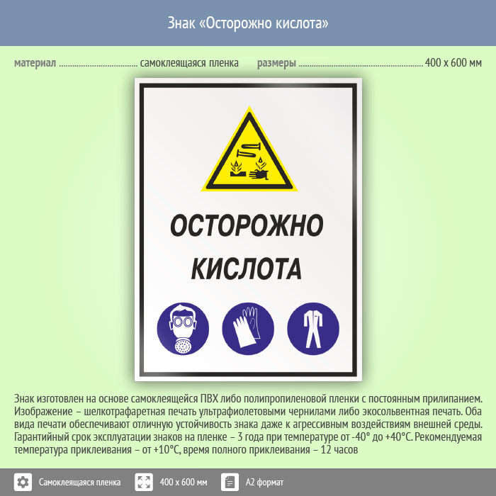 Знак «Осторожно кислота», КЗ-61 (пленка, 400х600 мм) в Нижнекамске купить