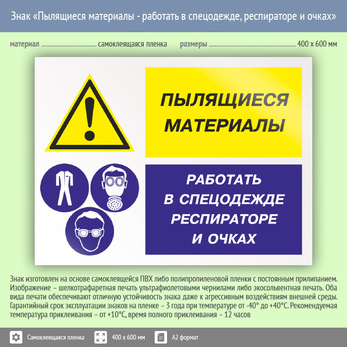 Знак «Пылящиеся материалы - работать в спецодежде, респираторе и очках», КЗ-79 (пленка, 600х400 мм) в Нижнекамске купить