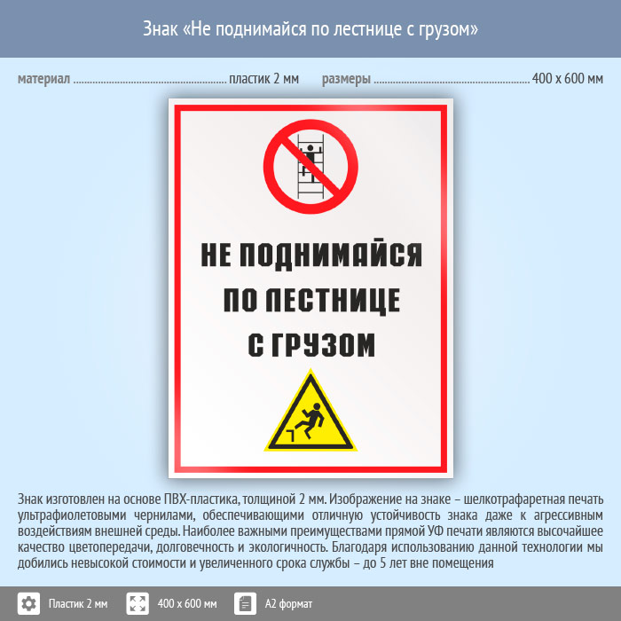 Знак «Не поднимайся по лестнице с грузом», КЗ-28 (пластик, 400х600 мм) в Нижнекамске купить