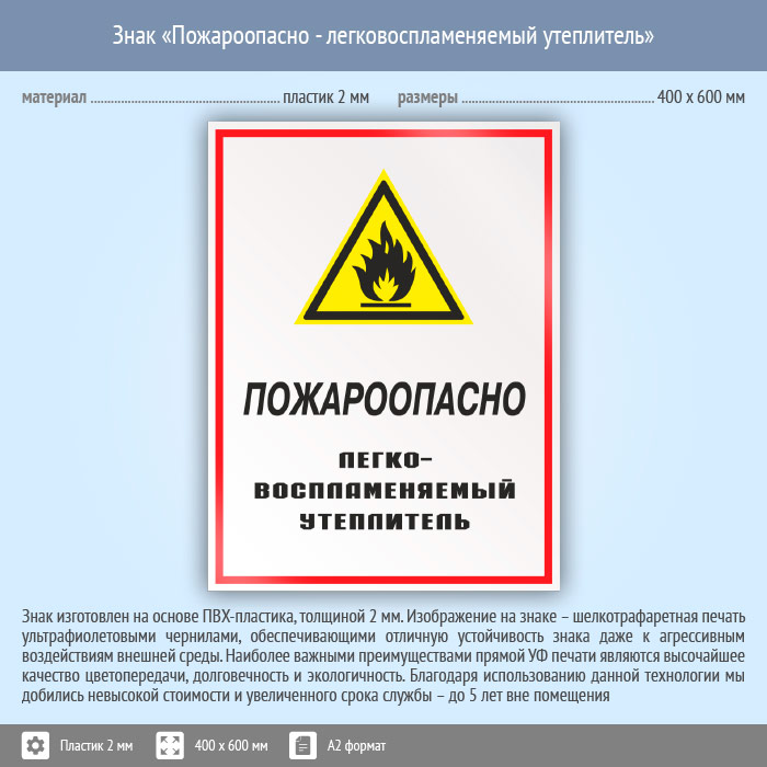 Знак «Пожароопасно - легковоспламеняемый утеплитель», КЗ-68 (пластик, 400х600 мм) в Нижнекамске купить