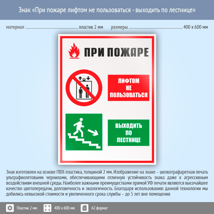 Знак «При пожаре лифтом не пользоваться - выходить по лестнице», КЗ-73 (пластик, 400х600 мм) в Нижнекамске купить
