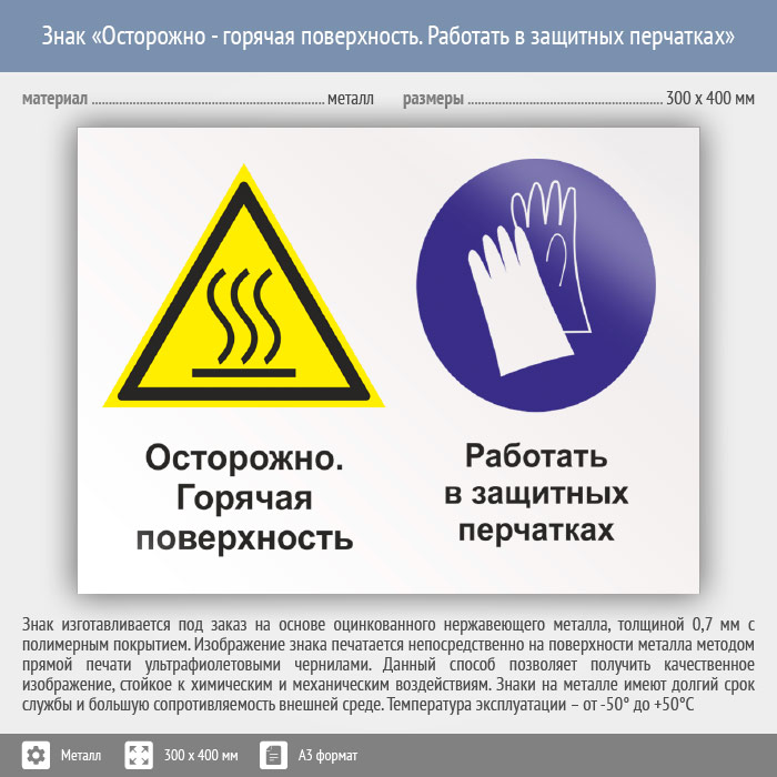Знак «Осторожно - горячая поверхность. Работать в защитных перчатках», КЗ-55 (металл, 400х300 мм) в Нижнекамске купить