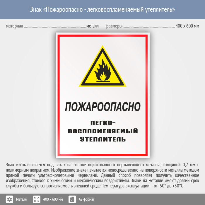 Знак «Пожароопасно - легковоспламеняемый утеплитель», КЗ-68 (металл, 400х600 мм) в Нижнекамске купить