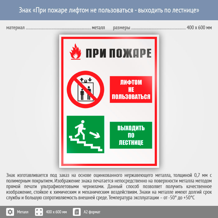 Знак «При пожаре лифтом не пользоваться - выходить по лестнице», КЗ-73 (металл, 400х600 мм) в Нижнекамске купить