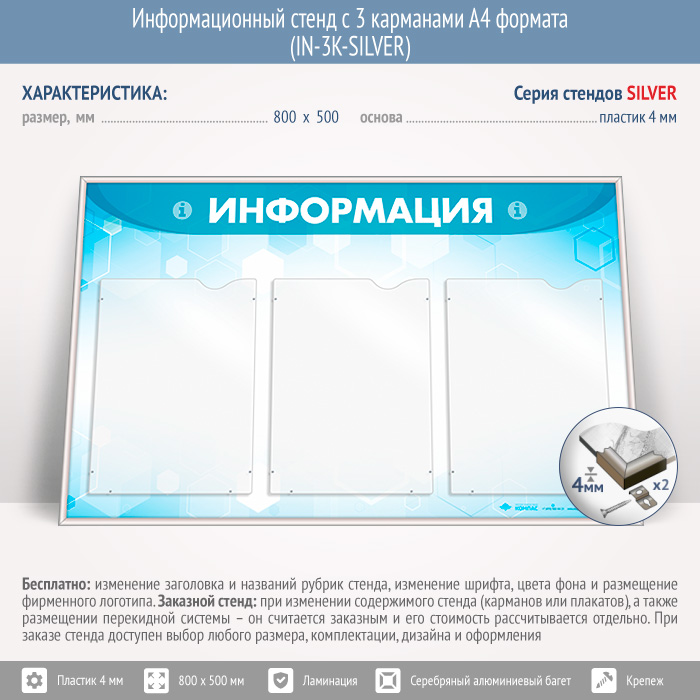 Информационный стенд с 3 карманами А4 формата (IN-3K-SILVER) в Нижнекамске купить