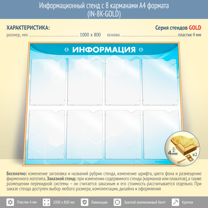 Информационный стенд с 8 карманами А4 формата (IN-8K-GOLD) в Нижнекамске купить