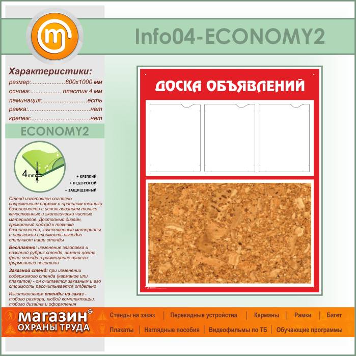 Стенд «Доска объявлений» с пробковым полотном и 3 карманами А4 формата (IN-04-ECONOMY2) в Нижнекамске купить
