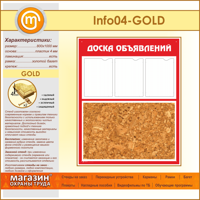 Стенд «Доска объявлений» с пробковым полотном и 3 карманами А4 формата (IN-04-GOLD) в Нижнекамске купить