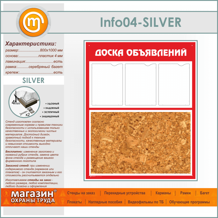 Стенд «Доска объявлений» с пробковым полотном и 3 карманами А4 формата (IN-04-SILVER) в Нижнекамске купить