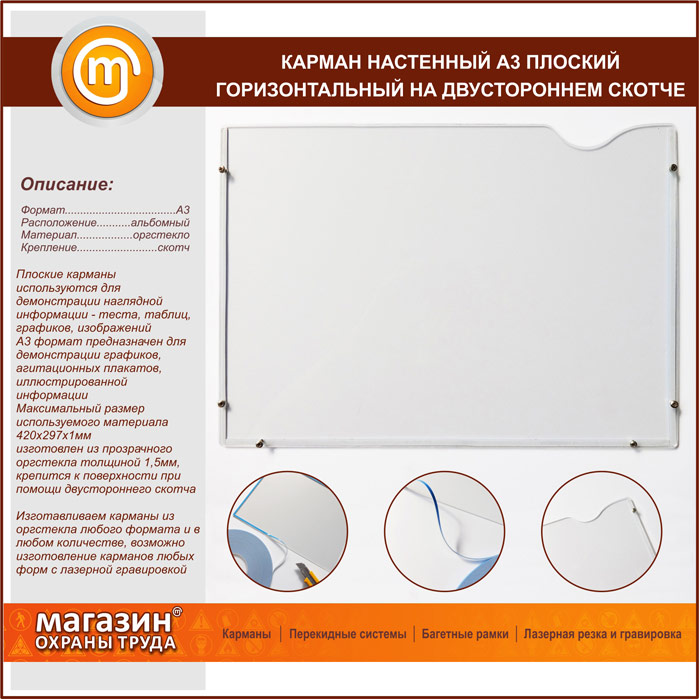 Карман настенный А3 плоский горизонтальный на двустороннем скотче в Нижнекамске купить