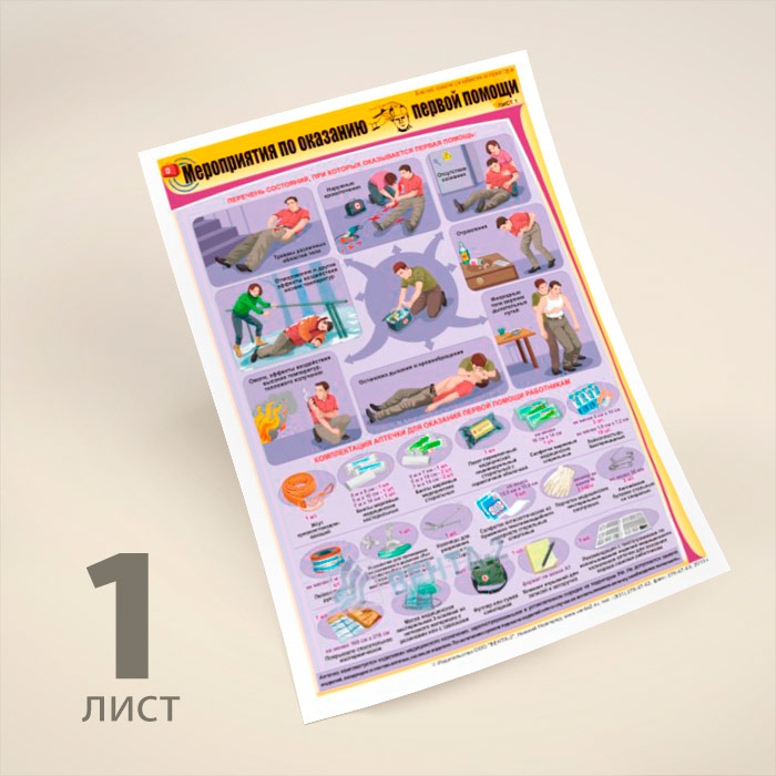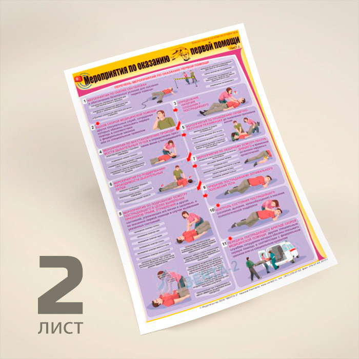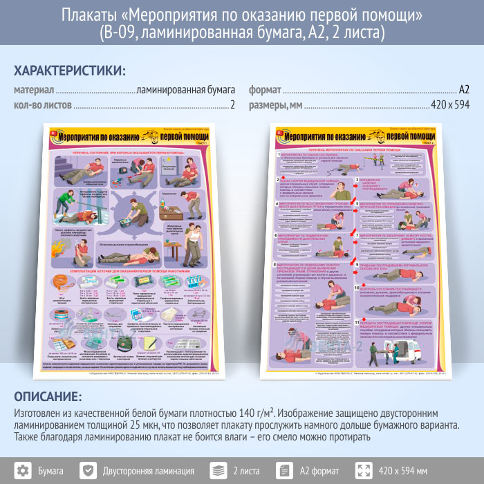 Плакаты «Мероприятия по оказанию первой помощи» (В-09, ламинированная бумага, А2, 2 листа) в Нижнекамске купить