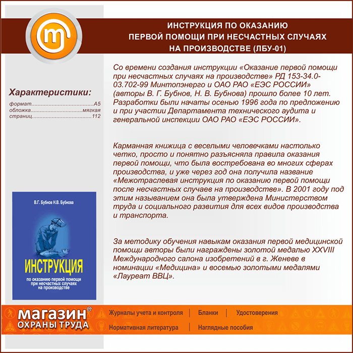 Инструкция по оказанию первой помощи при несчастных случаях на производстве (ЛБУ-01) в Нижнекамске купить