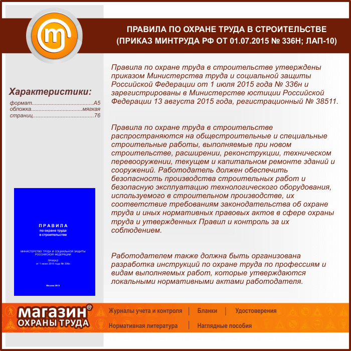Правила по охране труда в строительстве (Приказ Минтруда РФ от 01.07.2015 № 336н) (ЛАП-10) в Нижнекамске купить