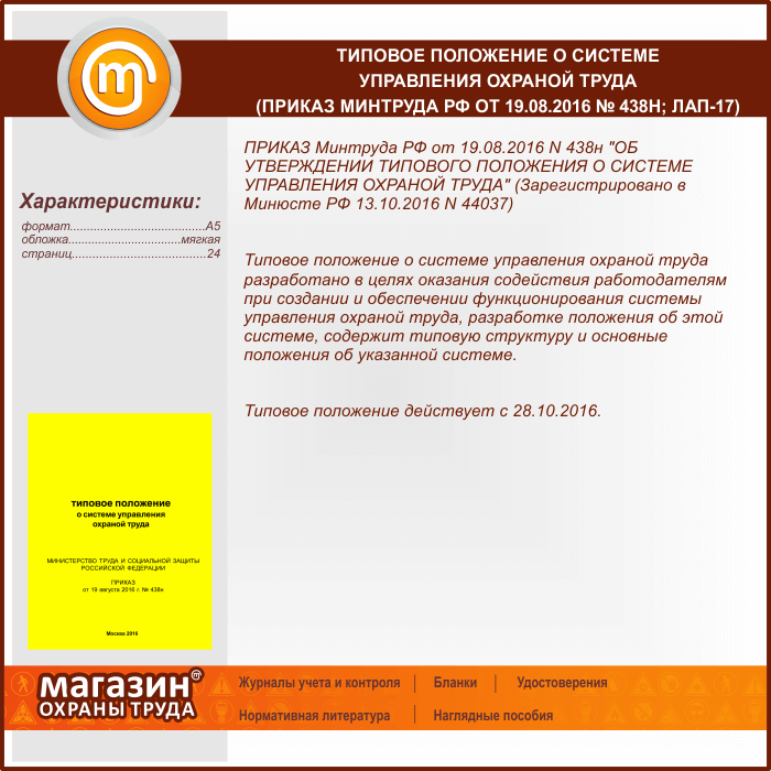 Типовое положение о системе управления охраной труда (Приказ Минтруда РФ от 19.08.2016 № 438н) (ЛАП-17) в Нижнекамске купить