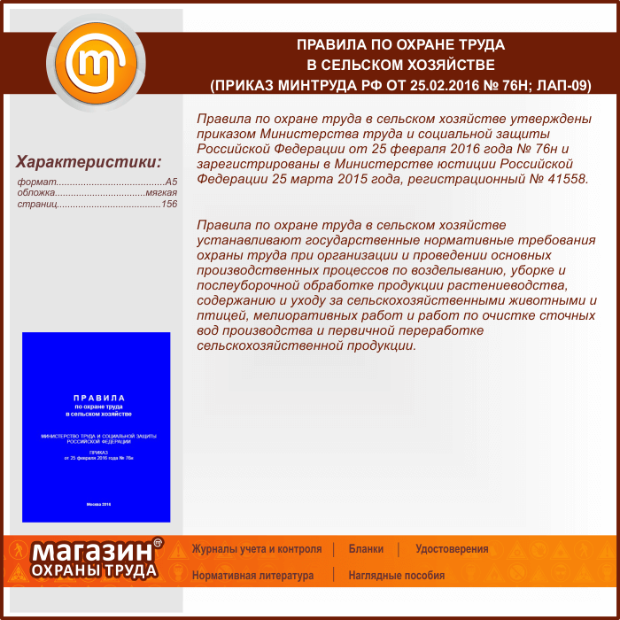 Правила по охране труда в сельском хозяйстве (Приказ Минтруда РФ от 25.02.2016 № 76н) (ЛАП-09) в Нижнекамске купить