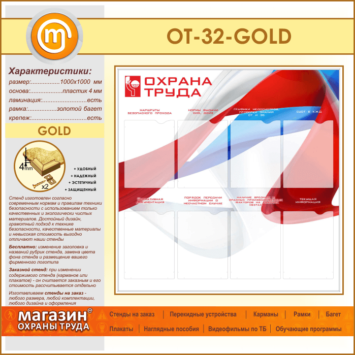 Стенд «Охрана труда» с 8 карманами (OT-32-GOLD) в Нижнекамске купить