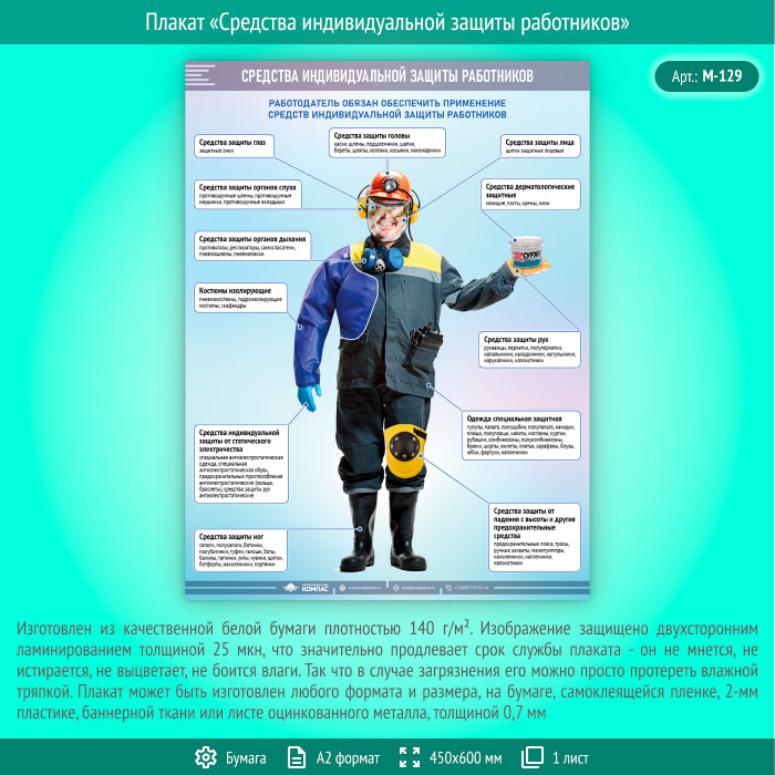 Плакат «Средства индивидуальной защиты работников» (М-129, ламинированная бумага, А2, 1 лист) в Нижнекамске купить