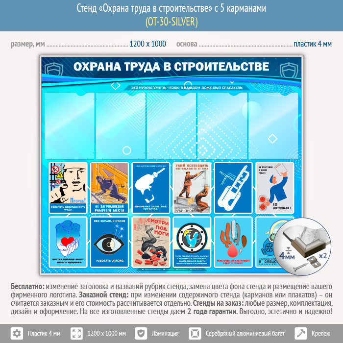 Стенд «Охрана труда в строительстве» с 5 карманами (OT-30-SILVER) в Нижнекамске купить