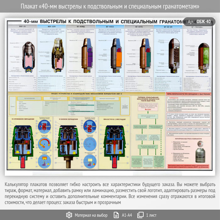 Плакат «40-мм выстрелы к подствольным и специальным гранатометам» (ОБЖ-40, 1 лист) в Нижнекамске купить