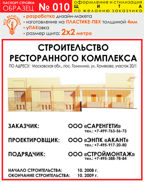 Предлагаем Вам изготовление паспорта стройки на баннерной ткани и ПВХ-пластике. В цену включены: разработка и согласование макета, изготовление и упаковка, а также НДС 18%. На данной странице представлены варианты материалов и размеров для образца № 10. Помимо представленных размеров мы можем изготовить паспорт объекта любого другого размера (цену уточняйте у менеджеров) и на любом материале (включая металл)