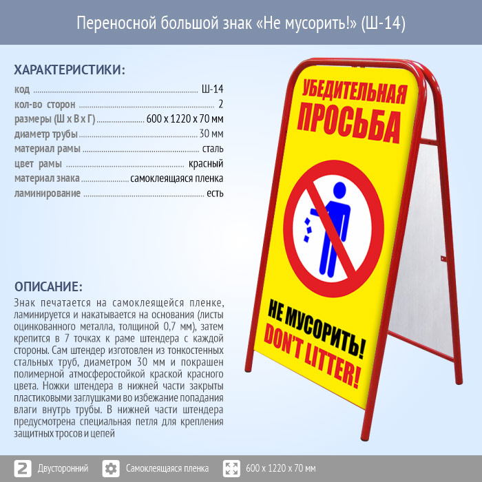 Переносной большой знак «Не мусорить!» (Ш-14, двусторонний, самоклеящаяся пленка) в Нижнекамске купить