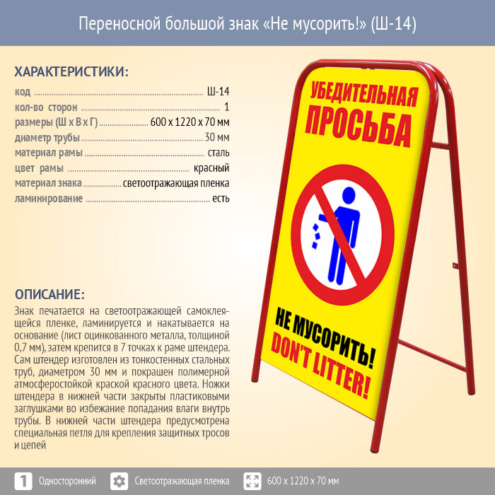 Переносной большой знак «Не мусорить!» (Ш-14, односторонний, светоотражающая пленка) в Нижнекамске купить