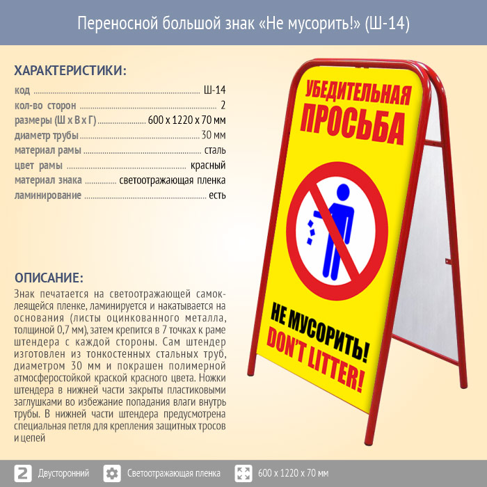 Переносной большой знак «Не мусорить!» (Ш-14, двусторонний, светоотражающая пленка) в Нижнекамске купить