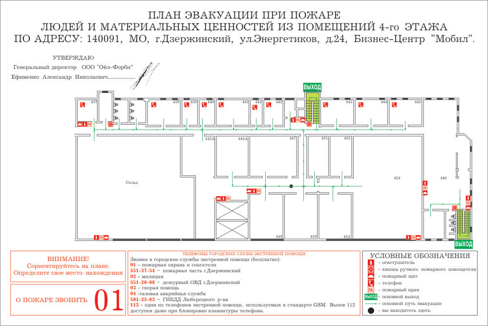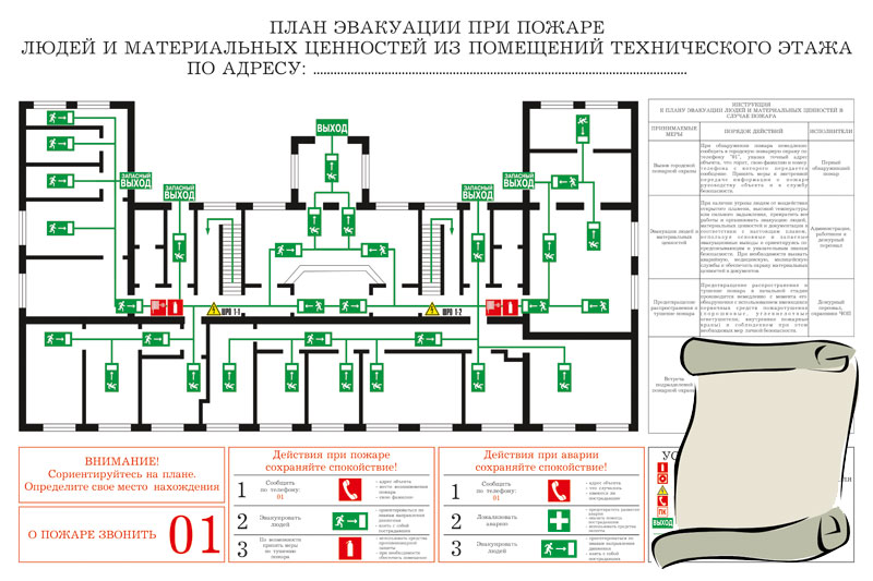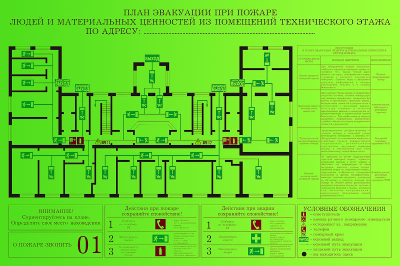 Текстовая часть планов эвакуации должна содержать инструкции о действиях в условиях чрезвычайной ситуации (при пожаре, аварии и т.п.), дополненные для наглядности знаками безопасности и символами