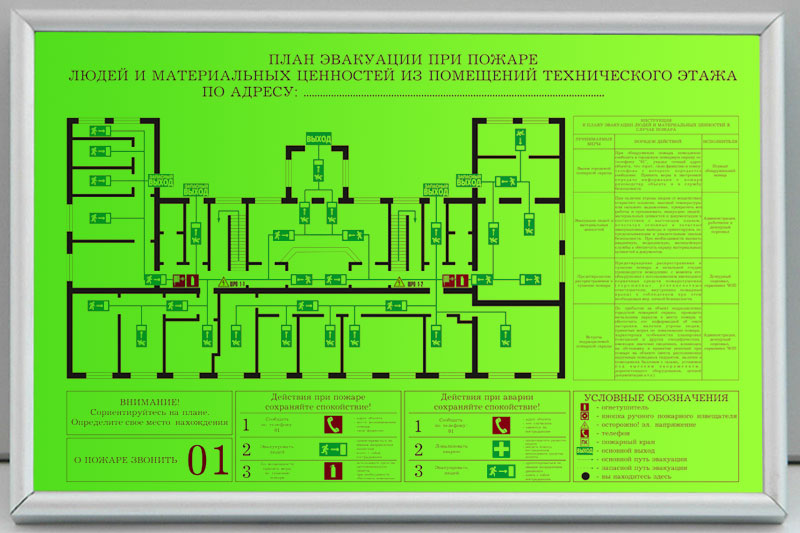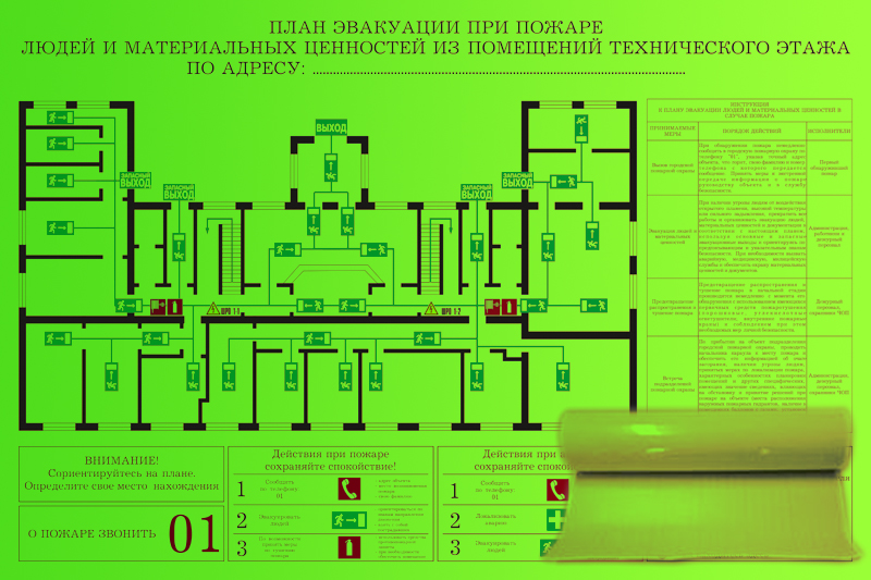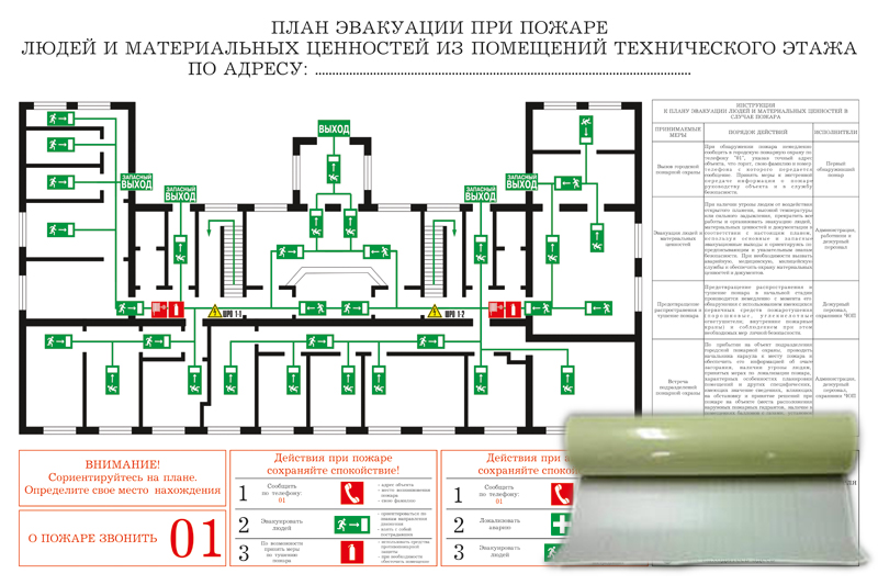 КРАЙНЕ РЕДКИЙ ФОРМАТ Используется для изготовления маршрутов эвакуации из зданий с большим количеством людей, например, торговых и развлекательных центров. Содержит схематичное изображение помещений с размещенными на нем средствами пожаротушения и извещения, путями эвакуации и условные обозначения. Содержит инструкцию при пожаре и инструкцию к подготовке и использованию огнетушителя |