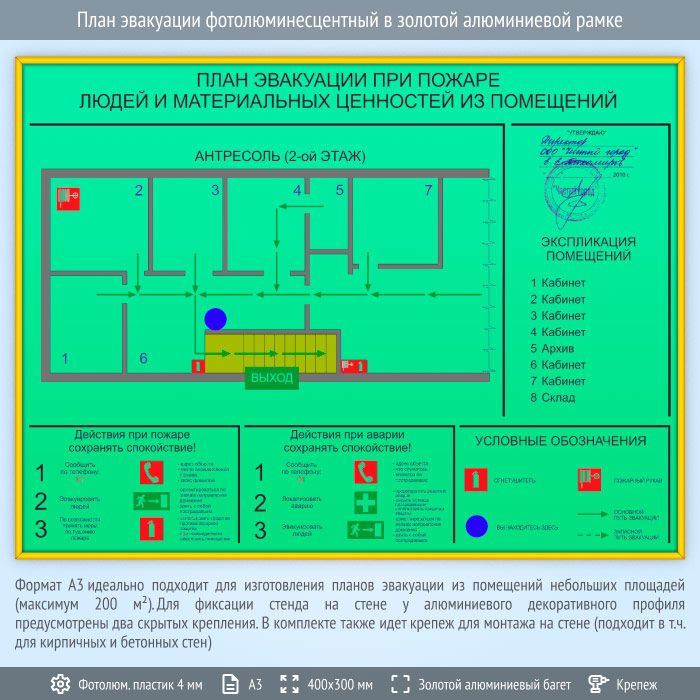 План эвакуации фотолюминесцентный в золотой алюминиевой рамке (А3 формат) в Нижнекамске купить