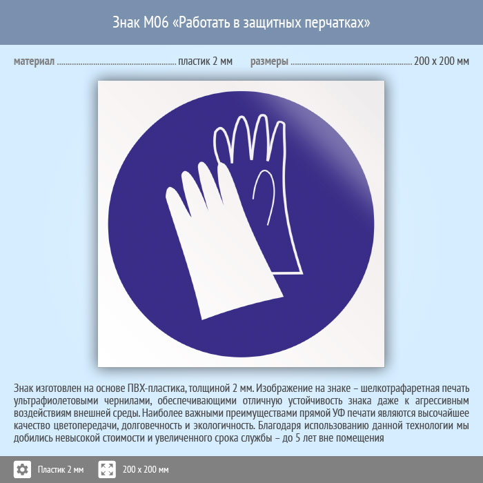 Знак M06 «Работать в защитных перчатках» (пластик, 200х200 мм) в Нижнекамске купить