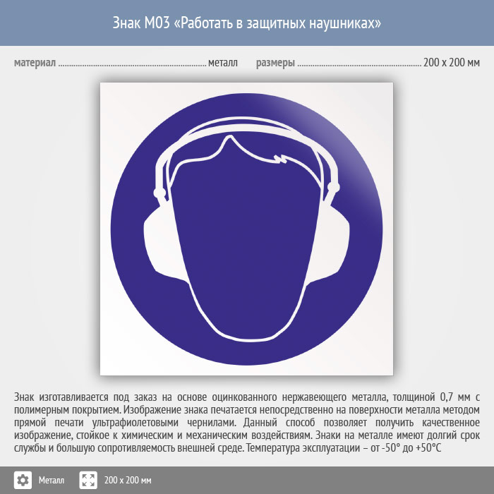 Знак M03 «Работать в защитных наушниках» (металл, 200х200 мм) в Нижнекамске купить