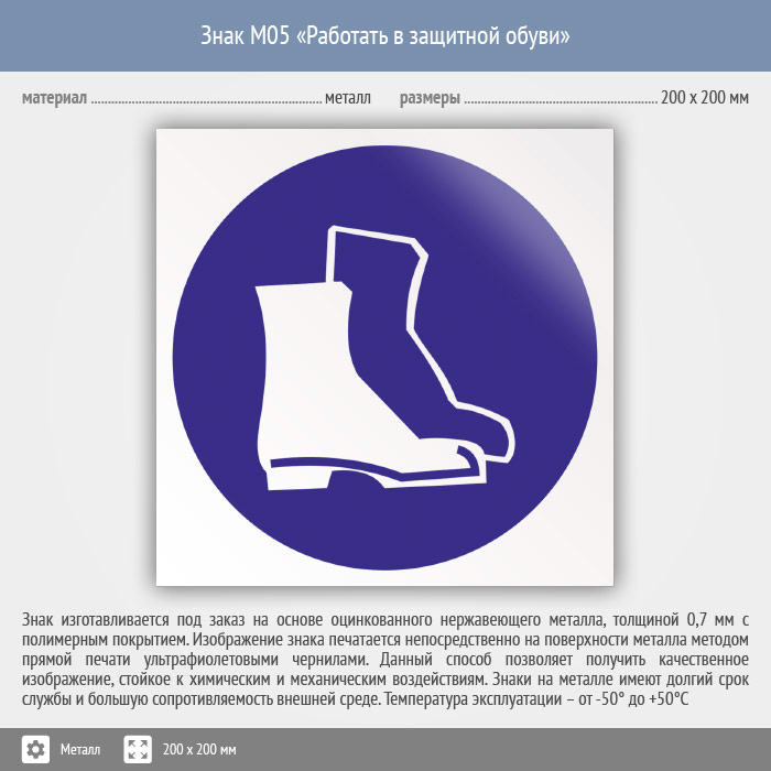 Знак M05 «Работать в защитной обуви» (металл, 200х200 мм) в Нижнекамске купить